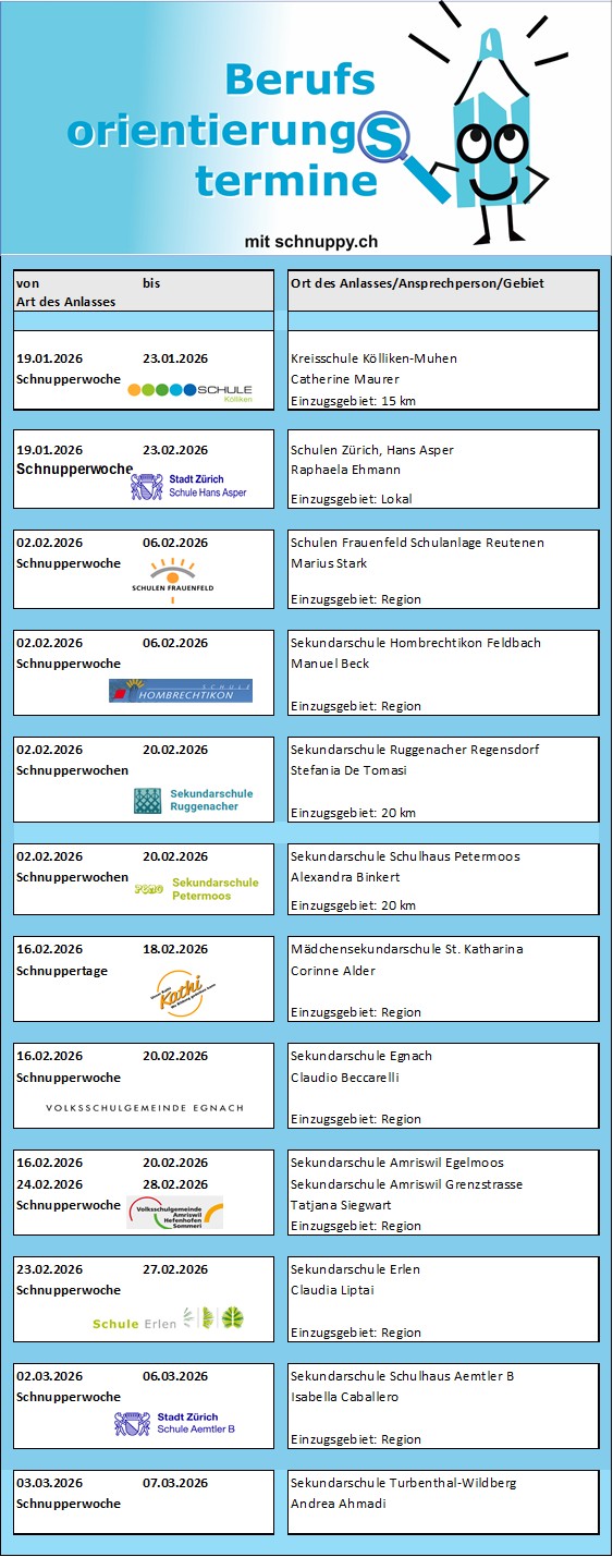 schnuppy.ch unterstützt die Schulen bei diesen Schnupper-Events, um ausreichend Schnupperstellen in der Region zu finden.
