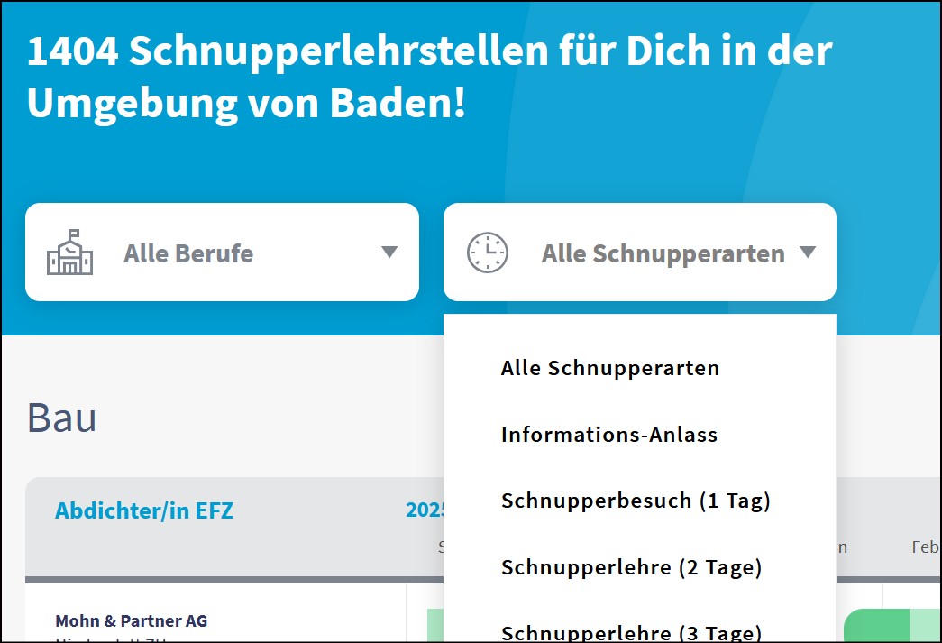 o Mit einem Klick kann man die eintägigen Schnupperangebote oder Informationsanlässe herausfiltern